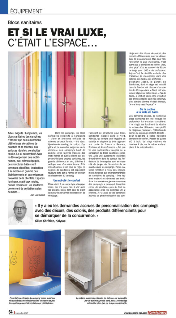 Dans l’un des derniers numéros (Septembre 2025), Décisions HPA consacre un dossier complet à la mutation des blocs sanitaires dans les campings, avec un focus sur l’expertise Kalysse.
